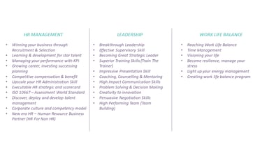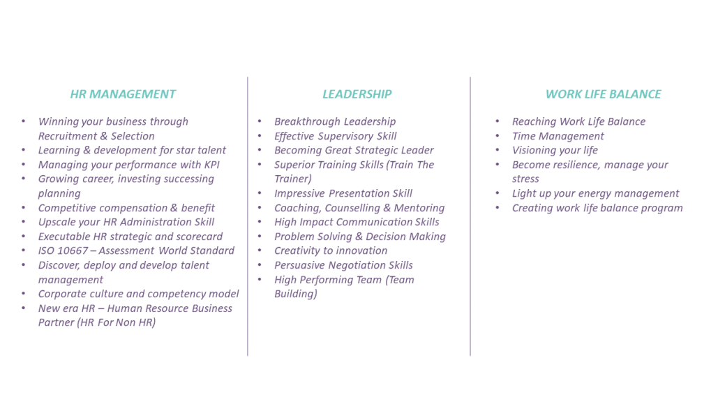 HVA CONSULTING telah berpengalaman untuk dapat memahami strategi korporasi, Strategi HR dan sasaran bisnis untuk diterjemahkan ke dalam program pengembangan SDM.